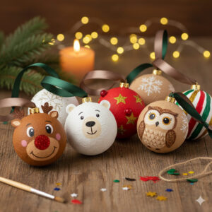 In der Happy Hearts Events Kreativwerkstatt entstehen echte Unikate für den Weihnachtsbaum: funkelnde Schaukelpferdanhänger aus Kunstharz mit Glitzer und Blüten – stilvoll verpackt in einer Geschenkbox – sowie liebevoll bemalte Christbaumkugeln aus Pappmaché, die als glänzender Hingucker oder niedliches Rentier erstrahlen.